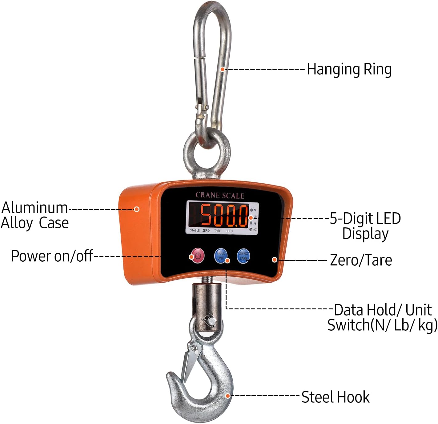 Operação fácil – 3 botões no painel de controle para você operar facilmente a balança do guindaste. Função de retenção de dados/tara/zero para uso mais conveniente. kg/lb/N unidade mutável, satisfazendo diferentes necessidades.