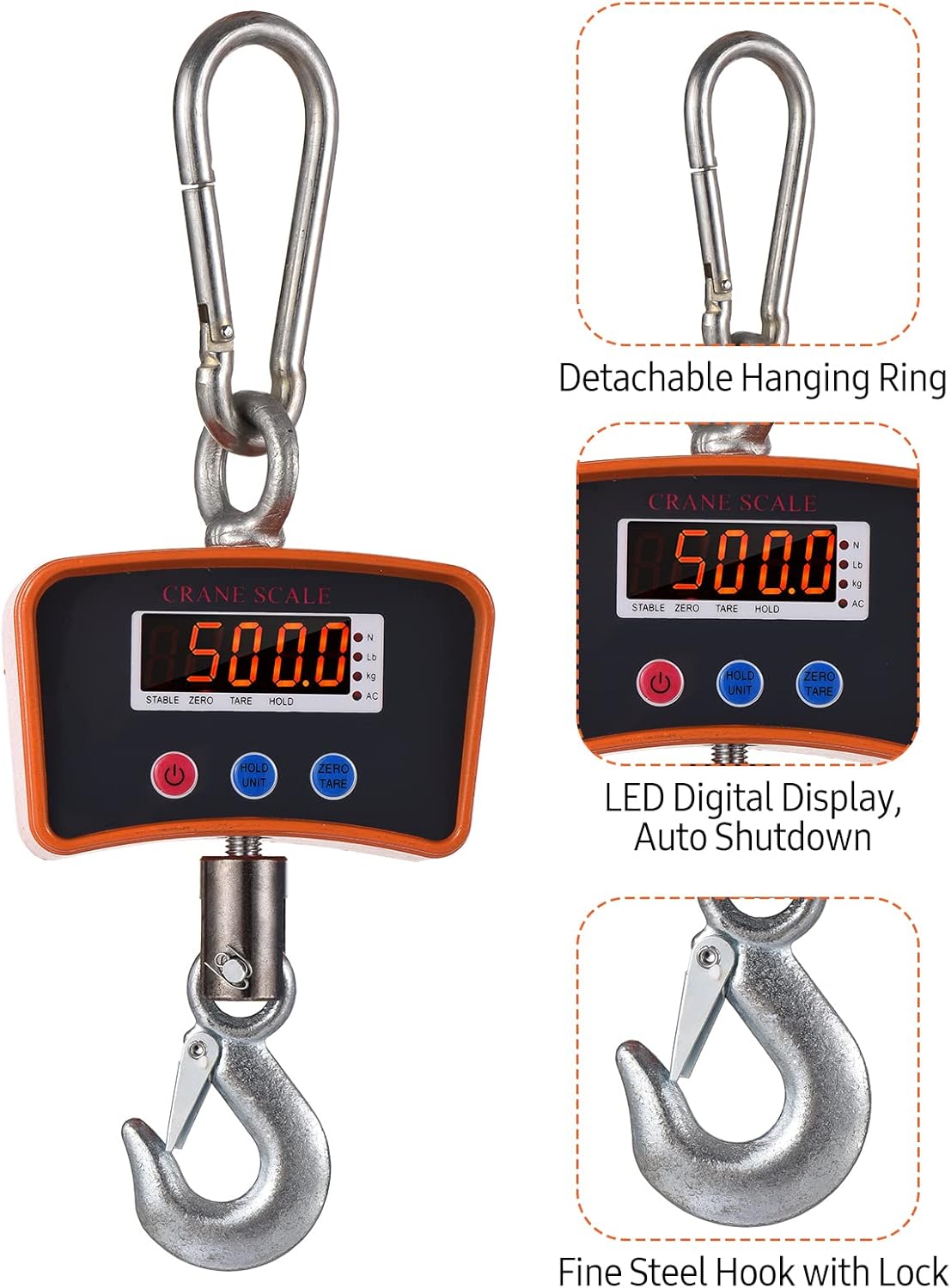 Balança de guindaste para serviço pesado — Com capacidade máxima de carga de 500kg (1102lbs), 200g de alta precisão, esta balança de guindaste digital é aplicável à indústria alimentícia/ siderúrgica, canteiro de obras, trabalho ao ar livre, etc.