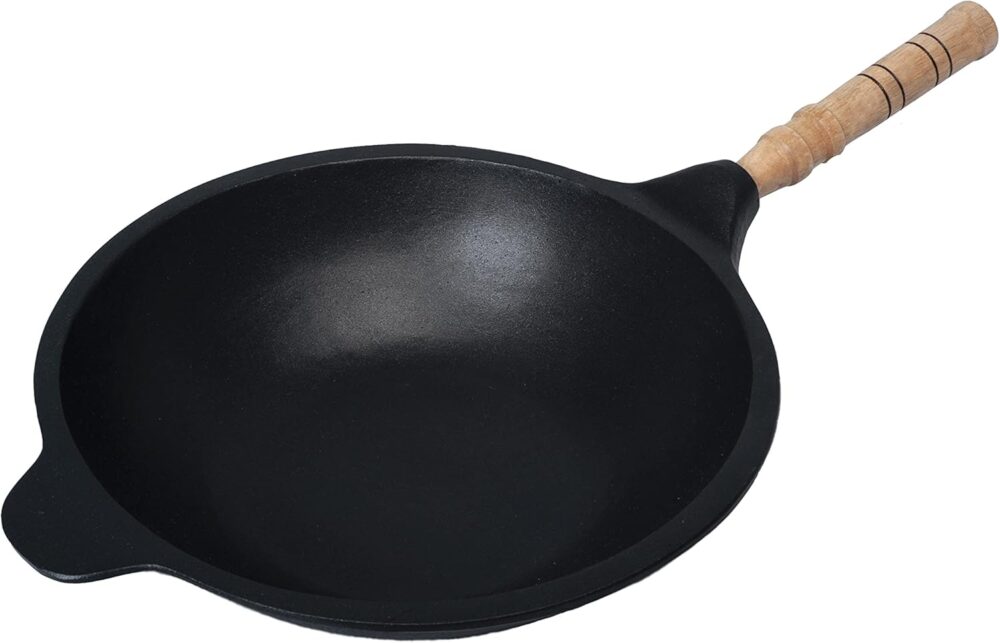 - Alumínio Fundido: O corpo do wok é feito de alumínio fundido, o que o torna resistente e fácil de limpar.