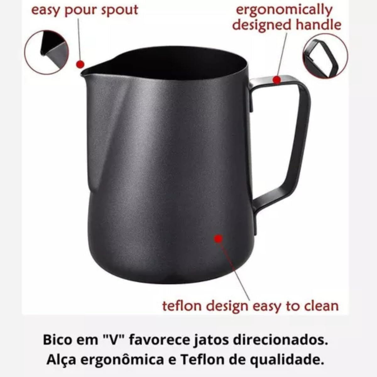 Muitas jarras leiteiras no mercado são feitas com materiais de baixa qualidade ou têm design inadequado, dificultando o controle do leite vaporizado. A Bule Jarra Leiteira Barista 600ml Inox Preto se destaca por: