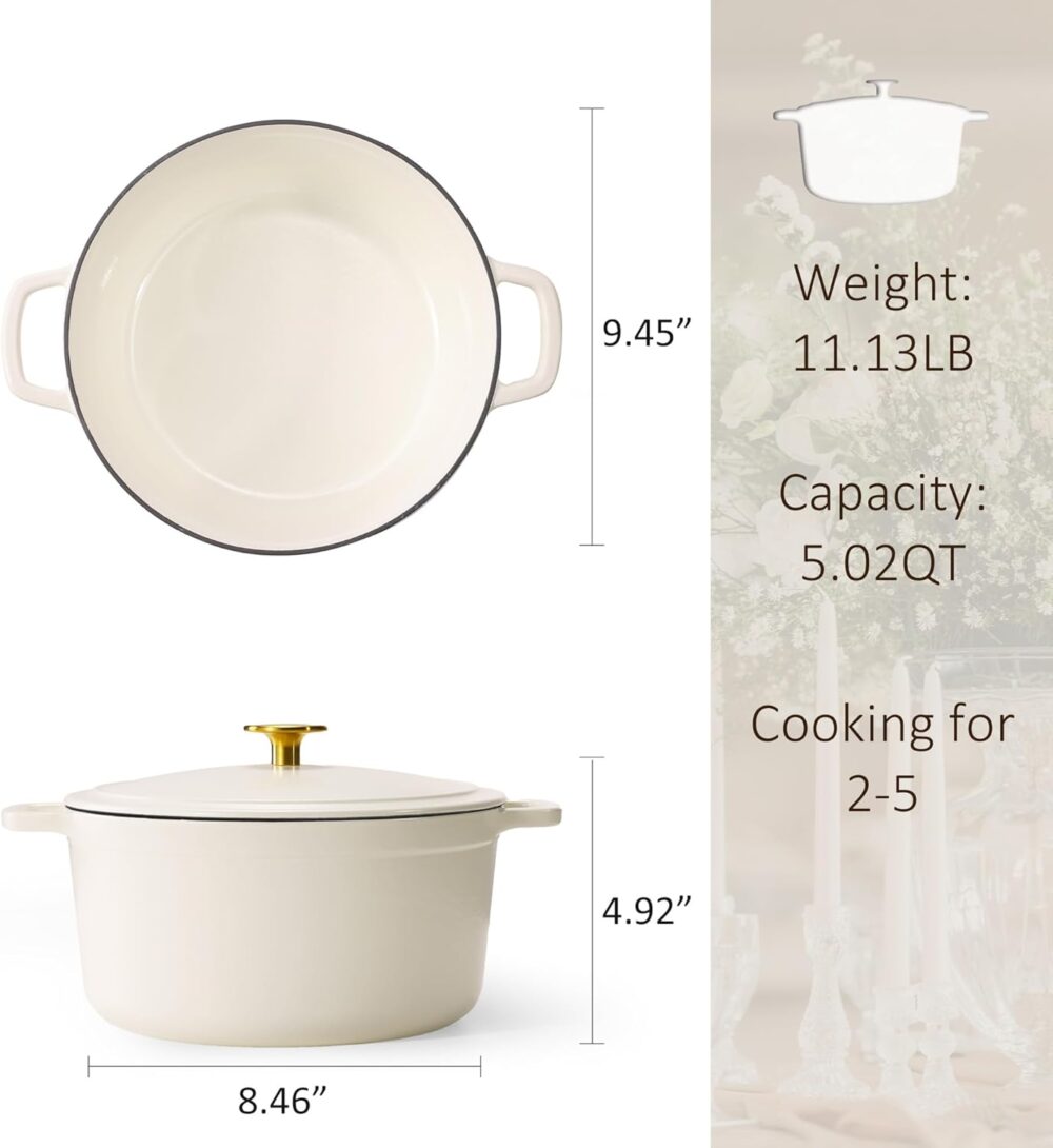 Review: Excellent dutch oven! Size is perfect at 5 fluid quarts, large enough to make soup for up to 8 people or cook a 3lb roast with some onions, potatoes and carrots for 6. I mainly use the pot for my Artisan Bread Loaves which everyone I know just loves, again… perfect size!Everything was packed so well in two sets of boxes, so no chips or scuffs upon arrival. Color is beautiful, very unique… retail box indicates that the color is “Melon”, not a traditional red which I’m relieved about, red dutches are overrated, very hard to match up with most kitchen color schemes, btw I love the shiny gold lid knob on this. Exterior enamled has a satin finish, it’s not high gloss like most, which to me makes it even more unique in my opinion… Though some have mentioned concerns with staining and easy cleanup, which I haven’t experienced any issues. It’s slightly heavy, but what cast iron dutch isn’t?!This dutch oven pot checks all of my boxes, feels and looks premium quality and like pure luxury… every person who’s seen it compliments me and asks where it’s from. I own some Cartoe flatware, again… premium quality! This brand is so spankin good, I’ve sent so many links and have told so many friends about it, honestly one of the best kitchenware brands I’ve owned!