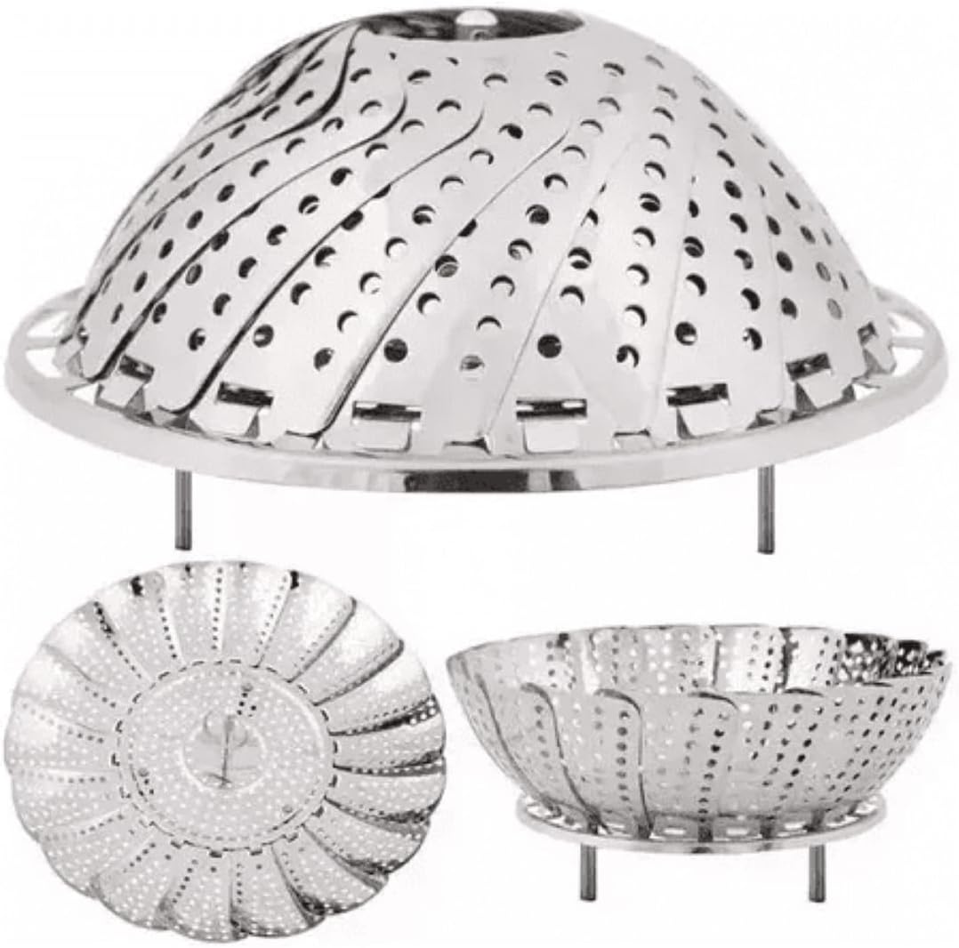 Cesto Para Cozimento de Legumes a Vapor em Inox, Cesto em Inox, Cozimento a Vapor, Vaporeira Inox Retrátil 26 cm Saúde, Utensílio de Cozinha Multifuncional Escorredor, Fruteira, cesto para Ovos O cesto inox para cozimento a vapor é perfeito para quem busca preparar legumes, verduras, frutas e peixes de forma prática e saudável, aproveitando todos os benefícios do cozimento a vapor. Fabricado em aço inox 304, é resistente à ferrugem e mantém o alimento em altura acima da água, devido aos seus pés de apoio, evitando perda de nutrientes. Com 26 cm de diâmetro aberto e design retrátil, adapta‑se a panelas de até 26 cm — o ideal é usar panela ligeiramente menor para fixação perfeita. Possui gancho central e alça lateral, facilitando inserir e retirar com segurança sem risco de queimaduras. O design multifuncional permite usar o cesto não só como vaporeira, mas também como escorredor, fruteira de mesa e suporte para banho‑maria. A vedação parcial da tampa retém o vapor enquanto preserva a suculência dos alimentos. O cozimento a vapor é a melhor forma de conservar vitaminas, minerais e sais minerais, em comparação ao cozimento convencional em água, pois não há contato direto do alimento com a água. Ideal para dietas balanceadas ou alimentação infantil. Fácil de limpar, pode ir à lava‑louças ou ser lavado com esponja macia. Compacto, prático, durável e versátil — um item essencial para quem cozinha cobaias saudáveis regularmente.