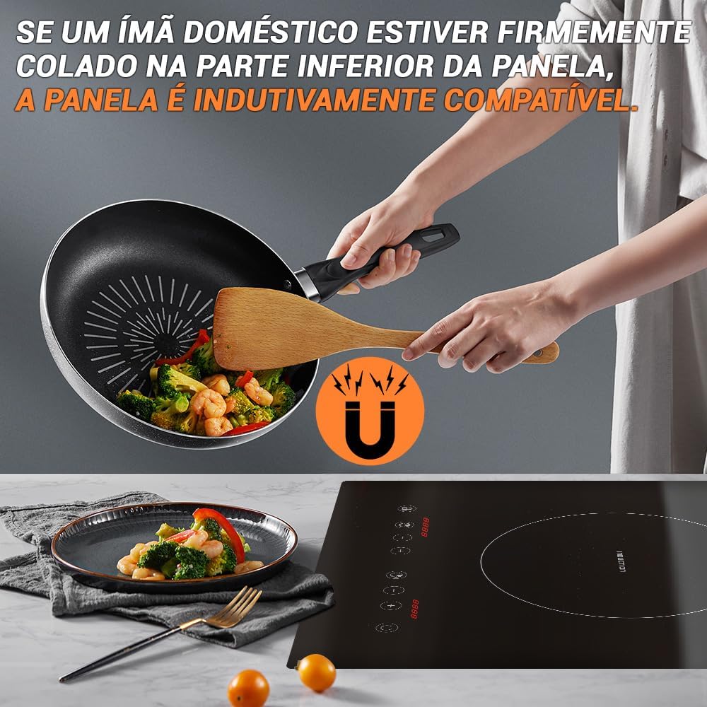 Você precisa usar panelas com fundo ferroso (magnético). Para verificar se uma panela é compatível, basta aproximar um ímã do fundo. Se o ímã grudar, a panela pode ser usada no cooktop de indução. Panelas de ferro fundido, aço inox com fundo triplo e algumas panelas esmaltadas são geralmente compatíveis.