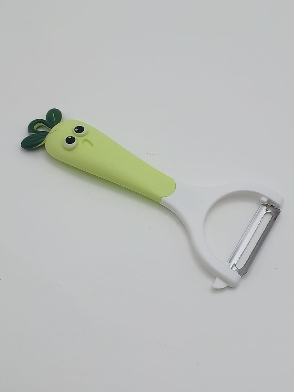 DESIGN CRIATIVO: Descascador com formato divertido de cenoura em verde limão, com detalhes decorativos e expressão facial adorável