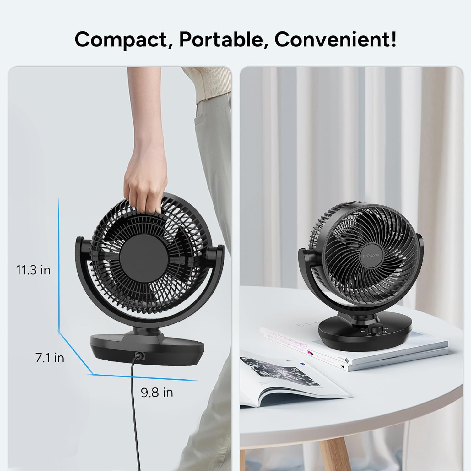 Review: I bought this fan to replace my 10+-yr-old 12-inch oscillating table fan that has faithfully kept my bedroom cool (it was starting to act weird and I feared for my safety).This little guy is powerful, even on Low speed. The air-flow is impressive. My room is about 16’x20′, and I can feel the breeze on every corner. It’s actually a bit too much on Med, and way too much on High (think “Auntie Em! Auntie Em!”… ha!). It’s not silent, but not too loud; provides a comfortable level of white noise for sleeping.The small footprint is so nice! Compared to the height and width of my old fan, it takes half the space but is twice as powerful.I like that the oscillating options are on the controller dial, not that old-school pull-plug on the back (which always broke off). The oscillation range is nice and wide, and the tilt adjustment is expansive.All in all, this little fan has a lot of bang for the buck. I’ll be getting another for the guest room!