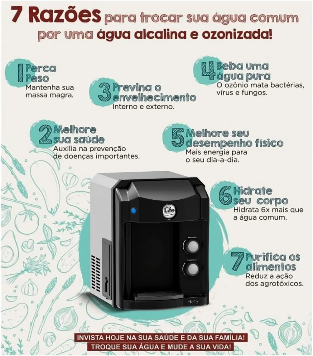 | Água alcalina ionizada com potenciais benefícios para a saúde. | A longo prazo, a troca de filtros pode gerar custos adicionais. |