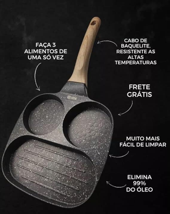 [Inserir imagem do produto com texto alternativo otimizado em português: “Imagem do Frigideira Antiaderente 3 em 1 Para Ovos Omelete Hamburguer, mostrando a superfície antiaderente e as divisórias práticas.”]