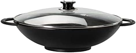 A Frigideira Wok Ferro Fundido 36cm Duas Alças c/Tampa de Vidro é um modelo de panela de ferro tradicional da culinária asiática, com estrutura arredondada e laterais mais altas, apropriada para cozinhar uma grande quantidade de alimentos de uma só vez.