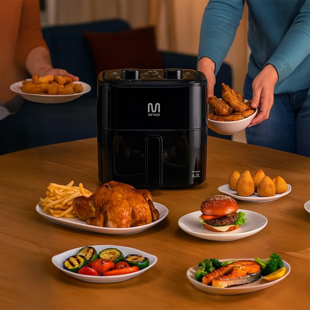 Logo de cara, o design da Fritadeira Elétrica sem óleo Air Fryer 4,2L 1320W 220V com T… chama a atenção. Ela tem um visual moderno e elegante, que combina com qualquer cozinha. A capacidade de 4,2 litros é ideal para famílias pequenas e médias, permitindo preparar porções generosas de batata frita, frango, legumes e muito mais. Uma coisa que reparei é que ela não ocupa tanto espaço na bancada quanto imaginei, o que é um ponto positivo pra quem tem cozinha pequena.