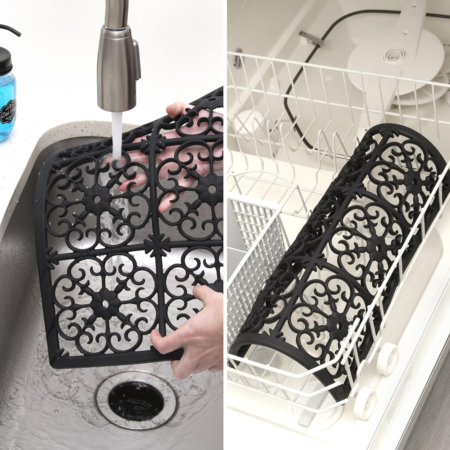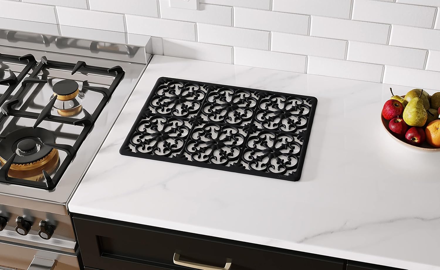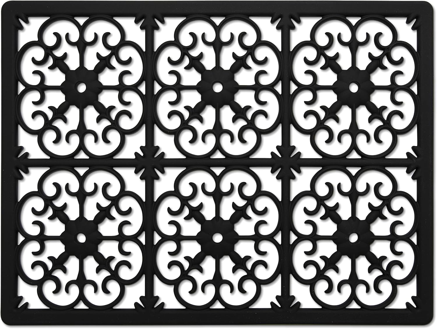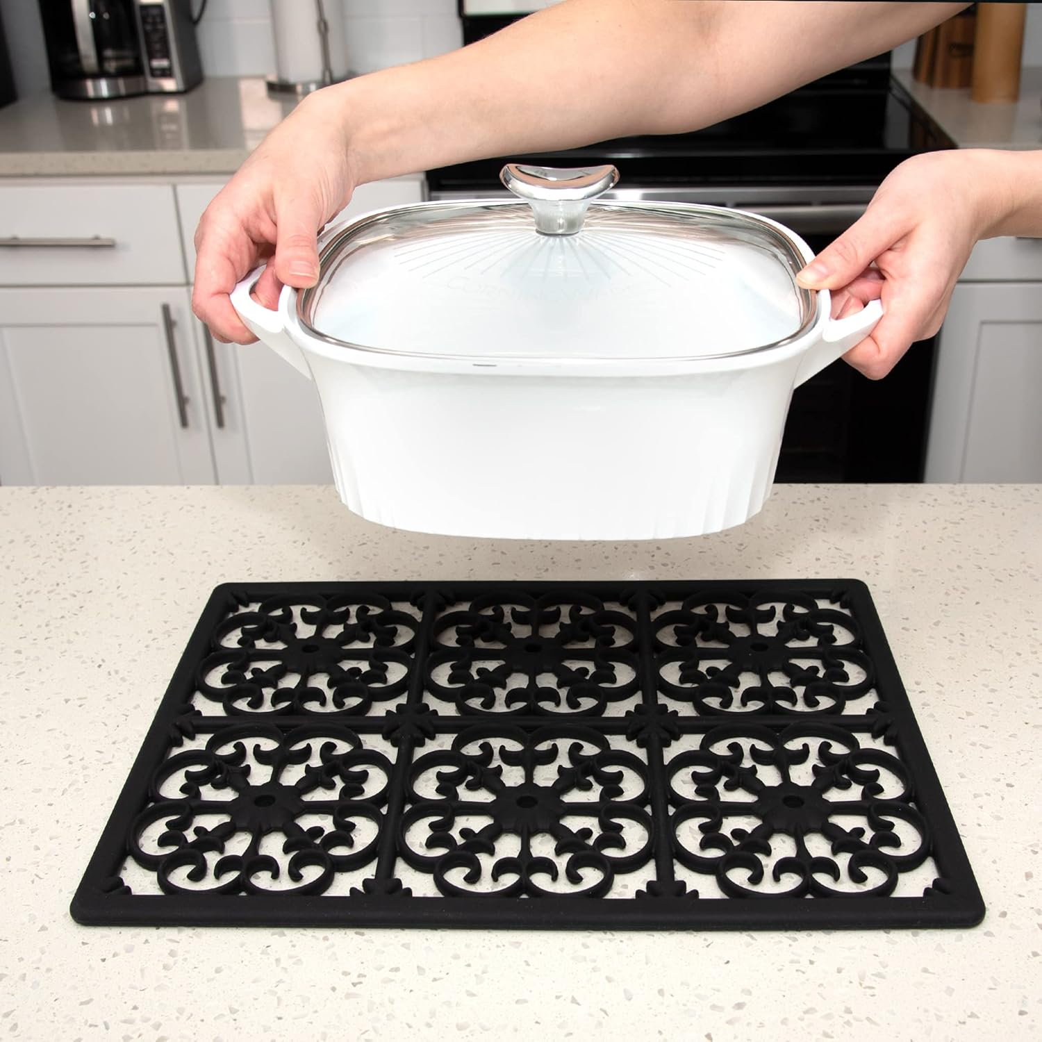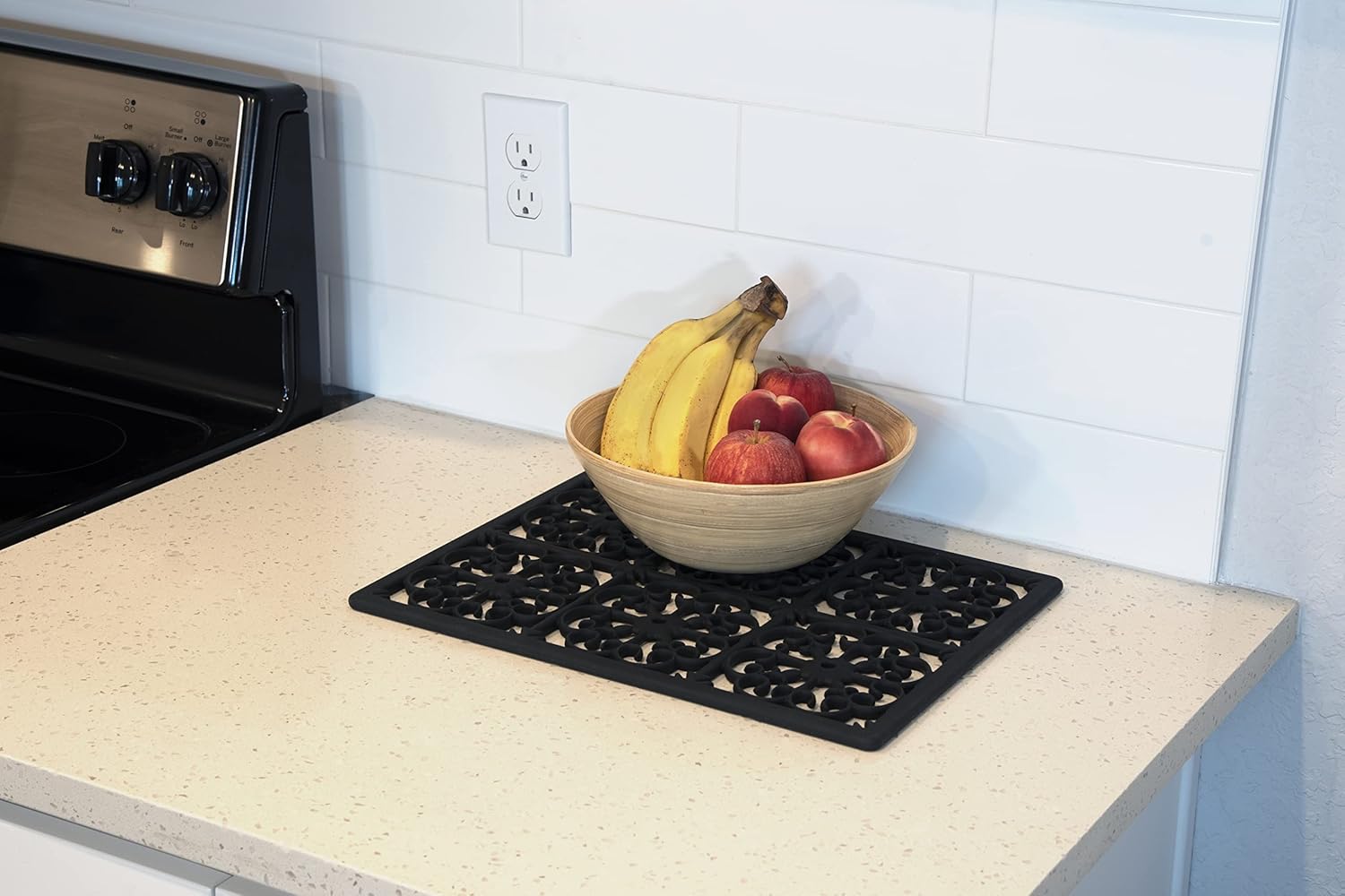 Review: Love this mat. It’s decorative and functional. Just got new quartz and wanted something to set hot pans on. Cleans up easily and looks nice. Great size and I just leave it out all the time.