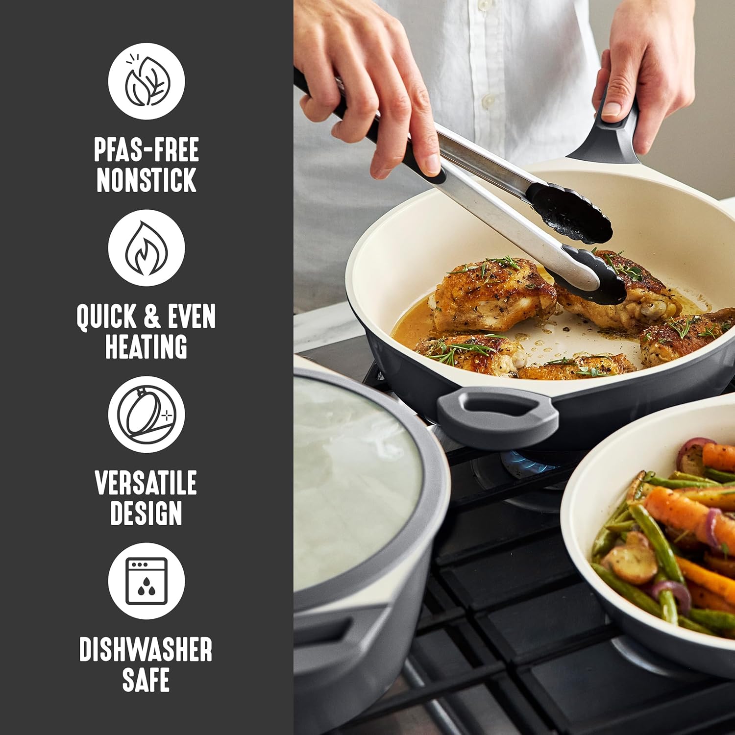 Com nosso revestimento antiaderente de cerâmica sem PFAS, corpos fundidos resistentes e alças que permanecem frescas, cozinhar com esta coleção é muito fácil. Projetadas para incrível versatilidade, estas panelas apresentam uma base de indução que proporciona distribuição uniforme de calor em todos os cooktops: indução, gás, elétrico, halogênio ou cerâmica. As alças são projetadas para combinar com o corpo e manter você confortável enquanto cozinha. Basta limpar a sujeira graças ao nosso revestimento antiaderente de cerâmica de fácil liberação.
