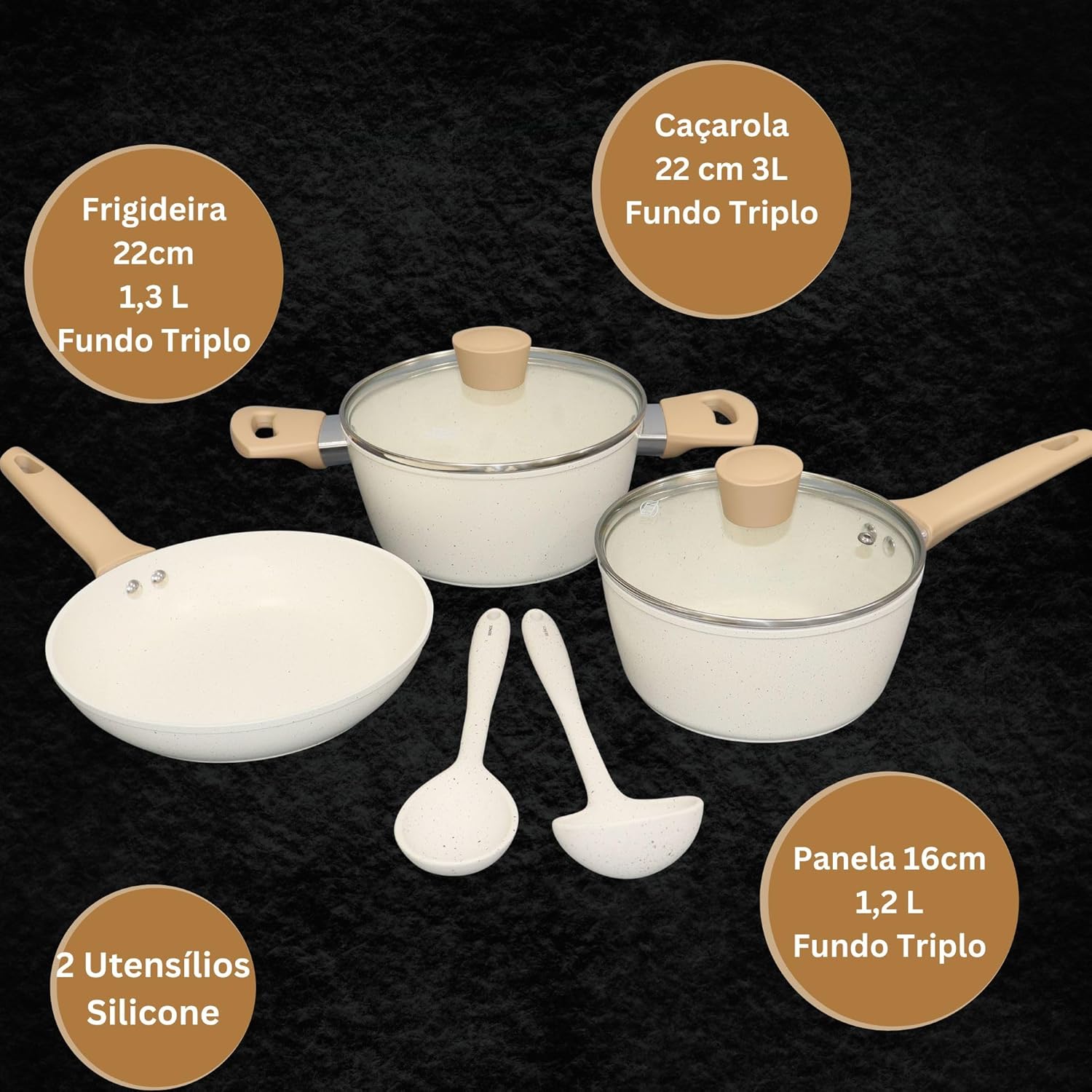 ✔ Composição do Produto: Este conjunto exclusivo inclui 1 Caçarola 22cm de 3L MTA, 1 Panela 16cm de 1,2L MTA, 1 Frigideira 22cm de 1,3L MTA – todos com fundo triplo para uma distribuição de calor superior, além de 2 utensílios em silicone de alta qualidade. Com uma composição cuidadosamente selecionada, o Jogo de Panelas Carmela Premium Exclusive atende a todas as suas necessidades culinárias, garantindo versatilidade e qualidade em cada peça. Desfrute da conveniência e da eficiência proporcionadas por este conjunto exclusivo, projetado para elevar sua experiência na cozinha.