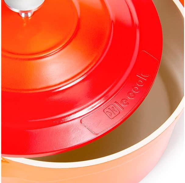 Seja pelo design ou pela tecnologia, as panelas e frigideiras Le Cook são destaque no universo gastronômico. Perfeitas para fazer cozidos e assados e também criadas para assar pães e bolos, diretamente na boca do fogão. Sua PARTE EXTERNA é feita de alumínio de grande espessura e alta densidade (melhor condução térmica e rápida indução) e com fundo resistente para ser utilizada em todos os tipos de fogões: elétrico, a gás, forno, vitrocerâmico e indução. Já a PARTE INTERNA é feita com revestimento antiaderente cerâmico, o que permite melhor distribuição de calor e cozimento uniforme dos alimentos. São livres de elementos nocivos como o PFOA e PTFE e exigem uso de menos óleo pelo alto poder antiaderente, o que torna o alimento mais saudável. Ainda contam com pintura externa resistente para suportar altas temperaturas e alças protetoras de silicone, proporcionando segurança e conforto durante o transporte. Produto aprovado e certificado pelo selo do Inmetro.