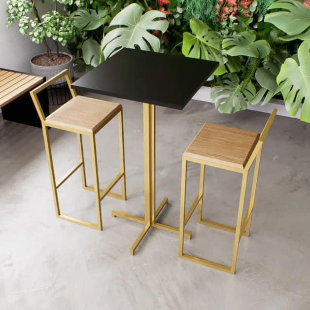 Jogo Mesa Alta Bistrô Quadrada Preta 2 Banquetas Pinus Confort Industrial Dourado