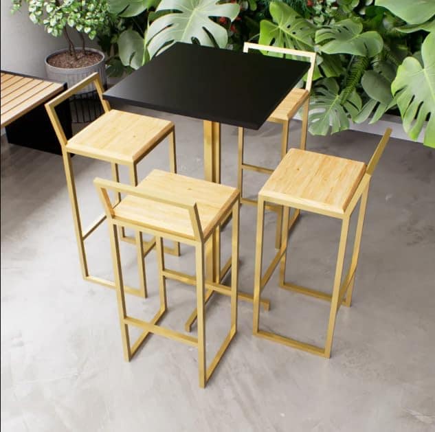 - Bares e Restaurantes: Utilize o jogo de mesa alta bistrô para criar áreas de espera ou espaços para refeições rápidas com um toque industrial e moderno.
