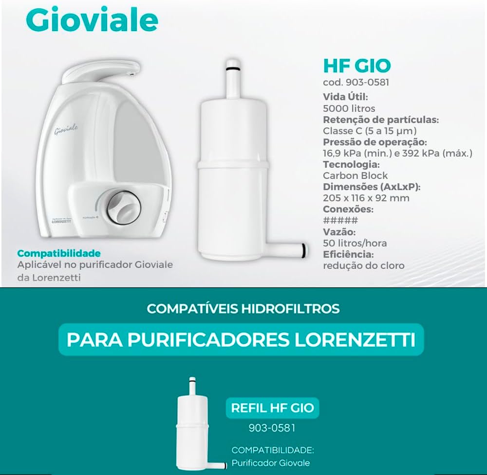 | Nome do modelo | Kit 05 Refil Filtro Hidrofiltros Compatível com Purificador Lorenzetti Refil Filtro Purificador Gioviale. |