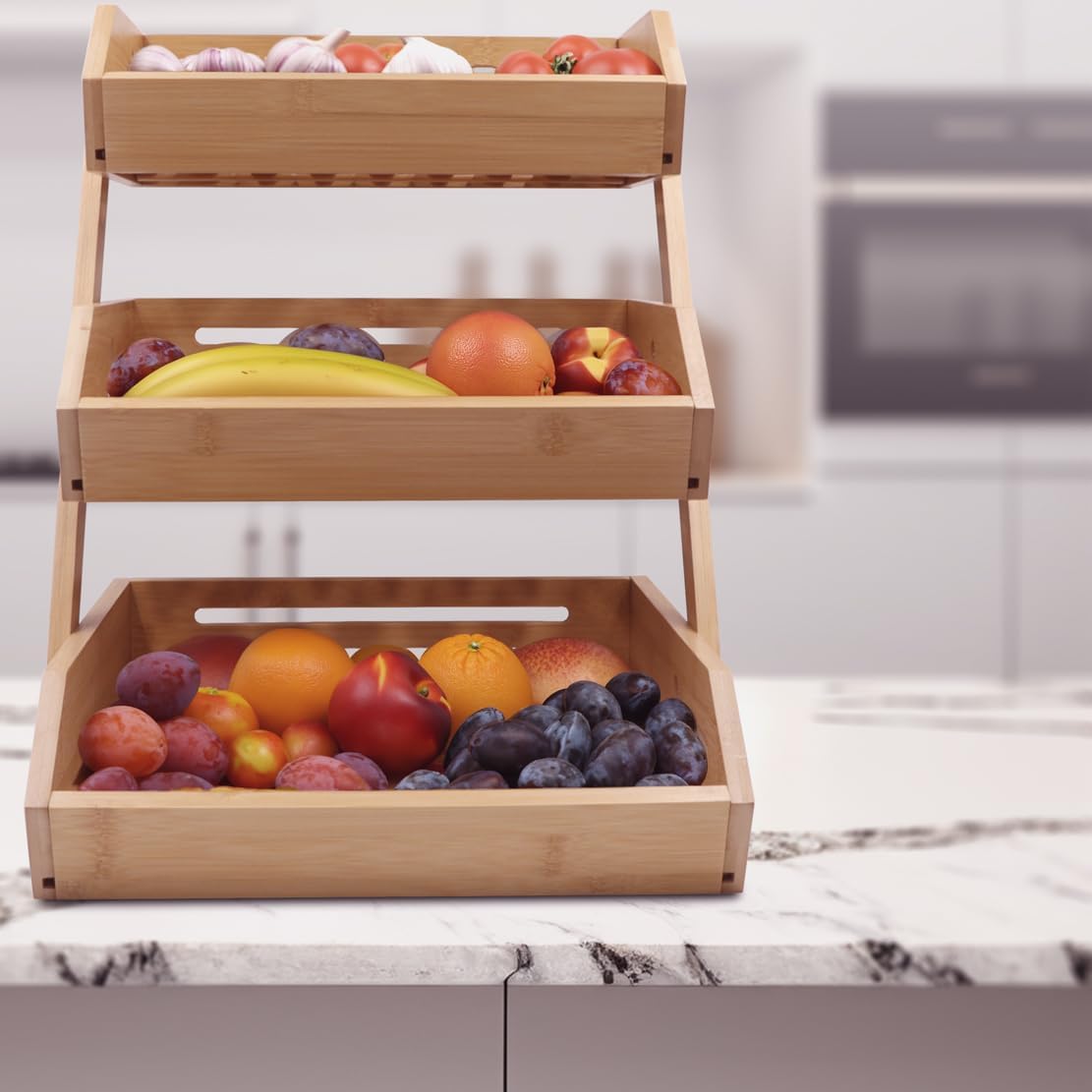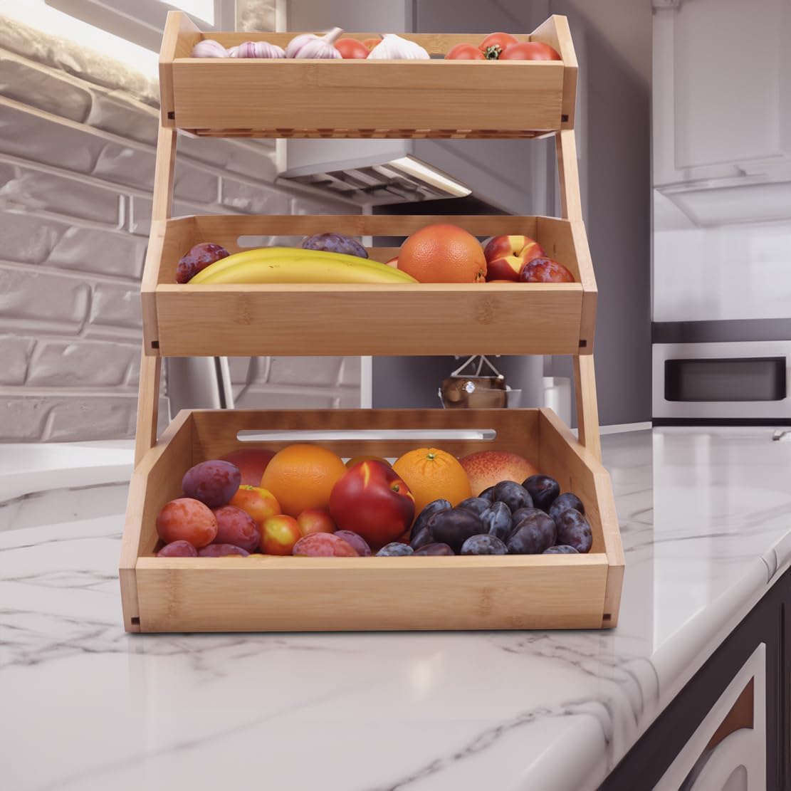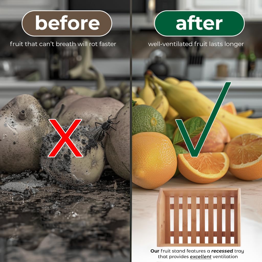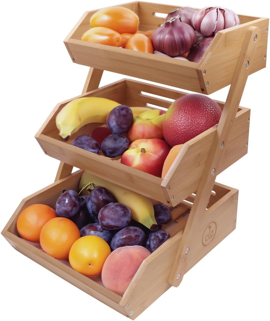 Review: I got this fruit basket, because we were not happy with our old metal basket. It bruised the fruit too easily, and the aesthetics of metal basket was less than appealing. First of all, the basket just looks more pleasing to the eyes. The natural bamboo finish tends to complement our kitchen style much more than the metal. Its simple yet elegant appearance adds a touch of sophistication to our kitchen island.Not only are the pleasing aesthetics present, the functionality is crucial. The 2-tier design allows for ample storage space without occupying too much countertop area. It encourages better fruit organization and accessibility. Not to mention it holds more than just fruit! It can also serve as a display stand for other items like vegetables, snacks, or even decorative pieces.Not to mention the maintenance is almost non existent. Pretty much just regular cleaning with a damp cloth and occasional oiling to preserve its finish are typically sufficient to keep it looking new.Overall, this fruit stand is perfect if you are looking for a one that stands out for its blend of functionality, design, and eco-friendliness. It addresses practical needs such as efficient fruit storage and easy maintenance while enhancing kitchen aesthetics. For those looking to organize fruits stylishly while keeping them fresh, this product seems like a worthwhile choice.