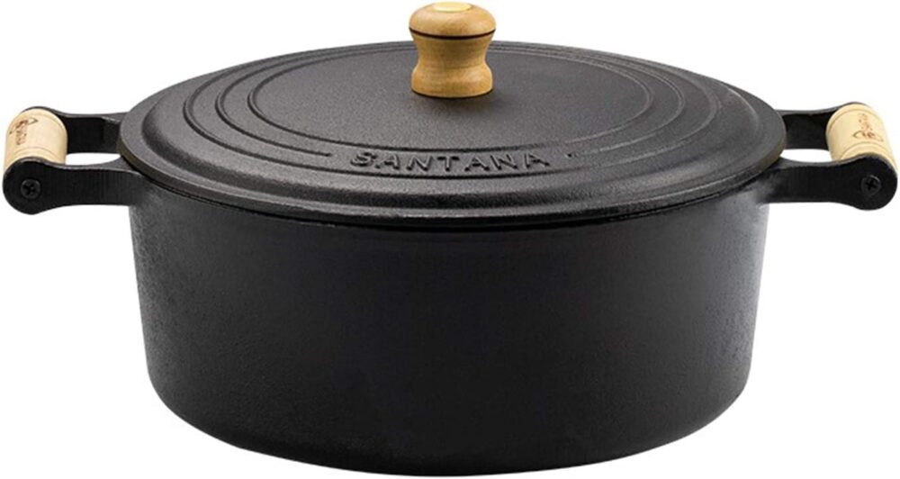 - Vantagens: A caçarola Santana e acompanhada por uma tampa de ferro e possui alças de madeira. É ideal para o preparo de arroz, frango, feijão, legumes e diversos outros alimentos.