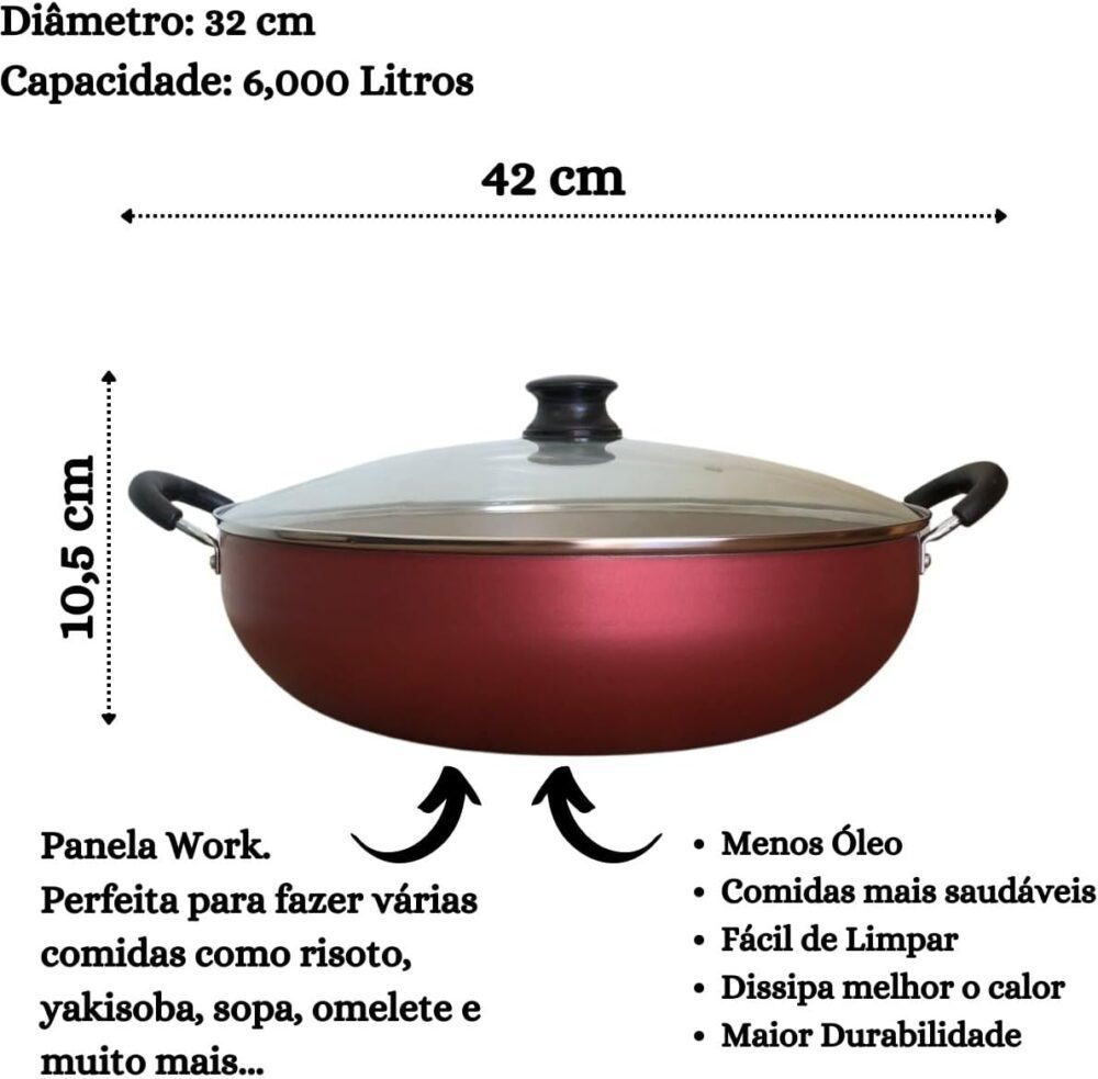 A Panela Wok Antiaderente Com Tampa é ideal para você que busca uma panela de qualidade e altíssima durabilidade, possui um diâmetro de 32cm e uma capacidade de 6 litros. Essa panela é ideal para cozinhar uma ampla variedade de pratos, especialmente aqueles que exigem uma grande superfície de cozimento.