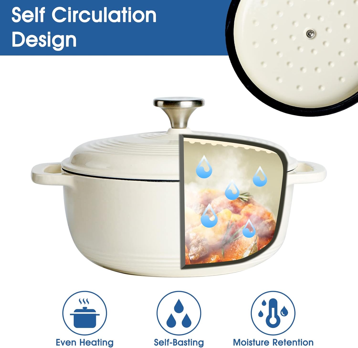 Preserva o sabor e os nutrientes: o design de autoumedecimento da tampa promove a circulação de vapor na panela de ferro fundido e permite que o vapor de água caia uniformemente sobre os alimentos para resultados macios e carnes que se soltam dos ossos.