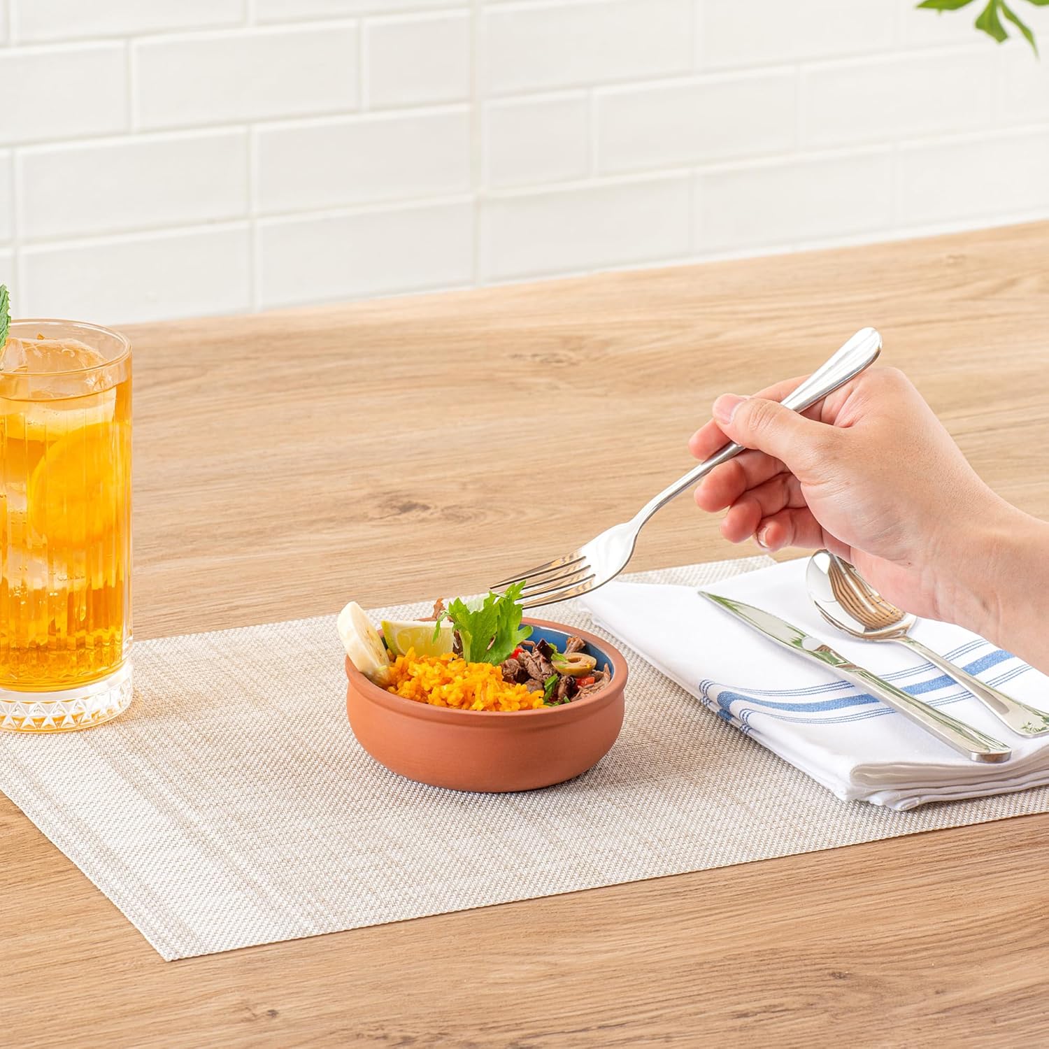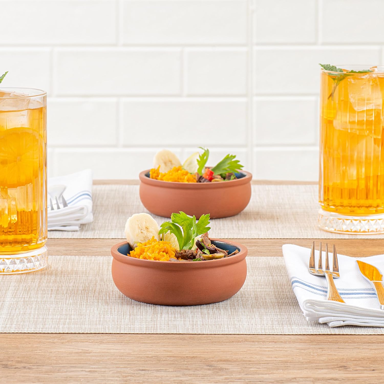 Interior com vidro azul: adicione um toque de cor aos seus pratos! Cada tigela de terracota possui um interior de vidro azul vibrante, tornando suas refeições visualmente atraentes. Um banquete para os olhos!