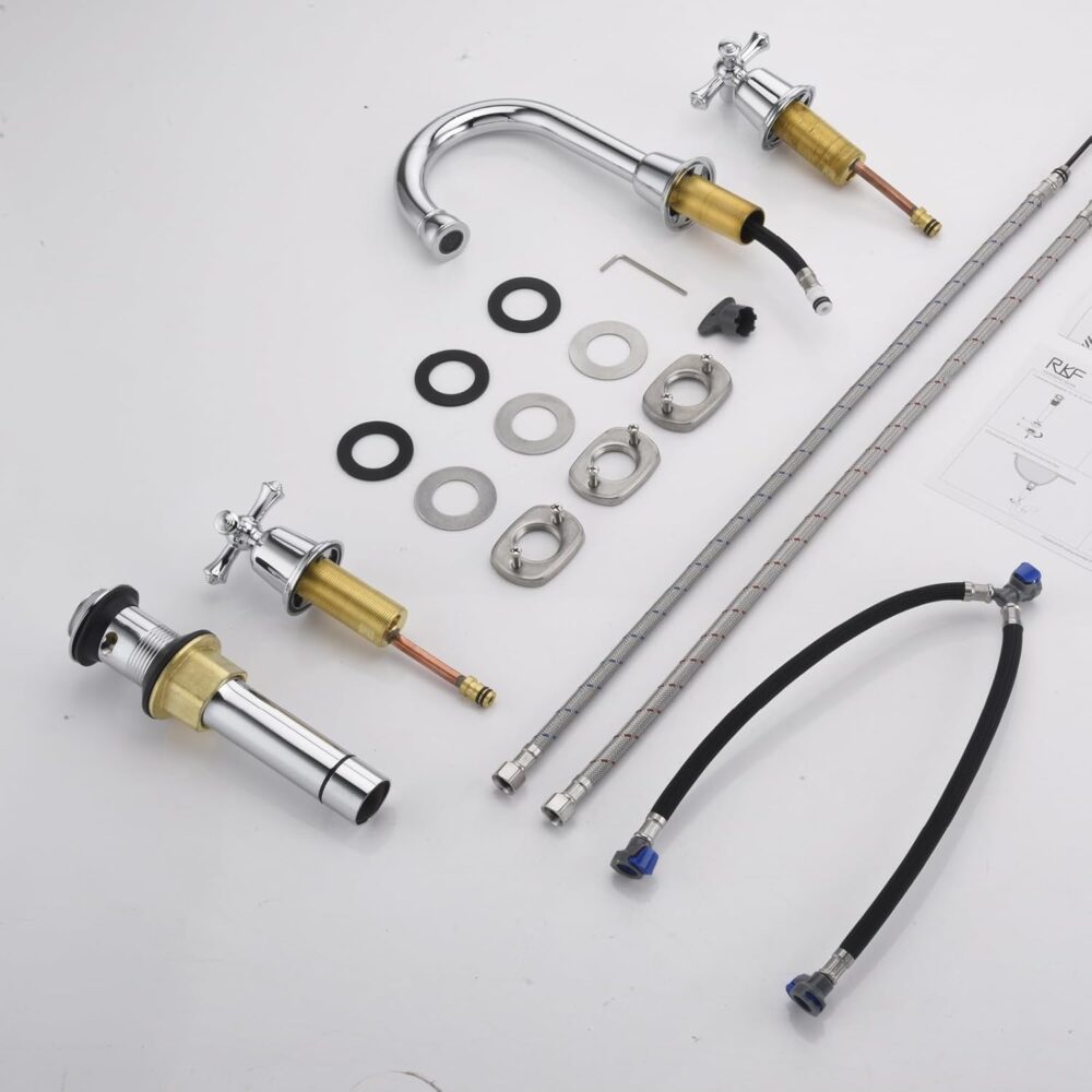 Instalação: RKF torneira com alça dupla cruzada para pia de banheiro com rolha de ralo de pia de metal resistente e durável e linhas de água CUPC é fácil de instalar sozinho sem um encanador!