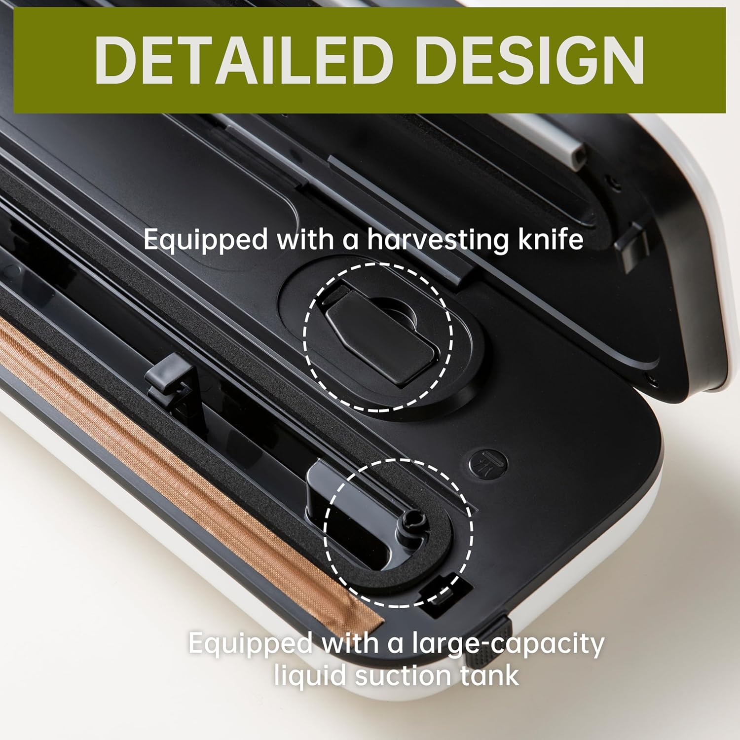 • Compartimento para rolo de embalagem: Facilita o corte e o armazenamento do rolo.