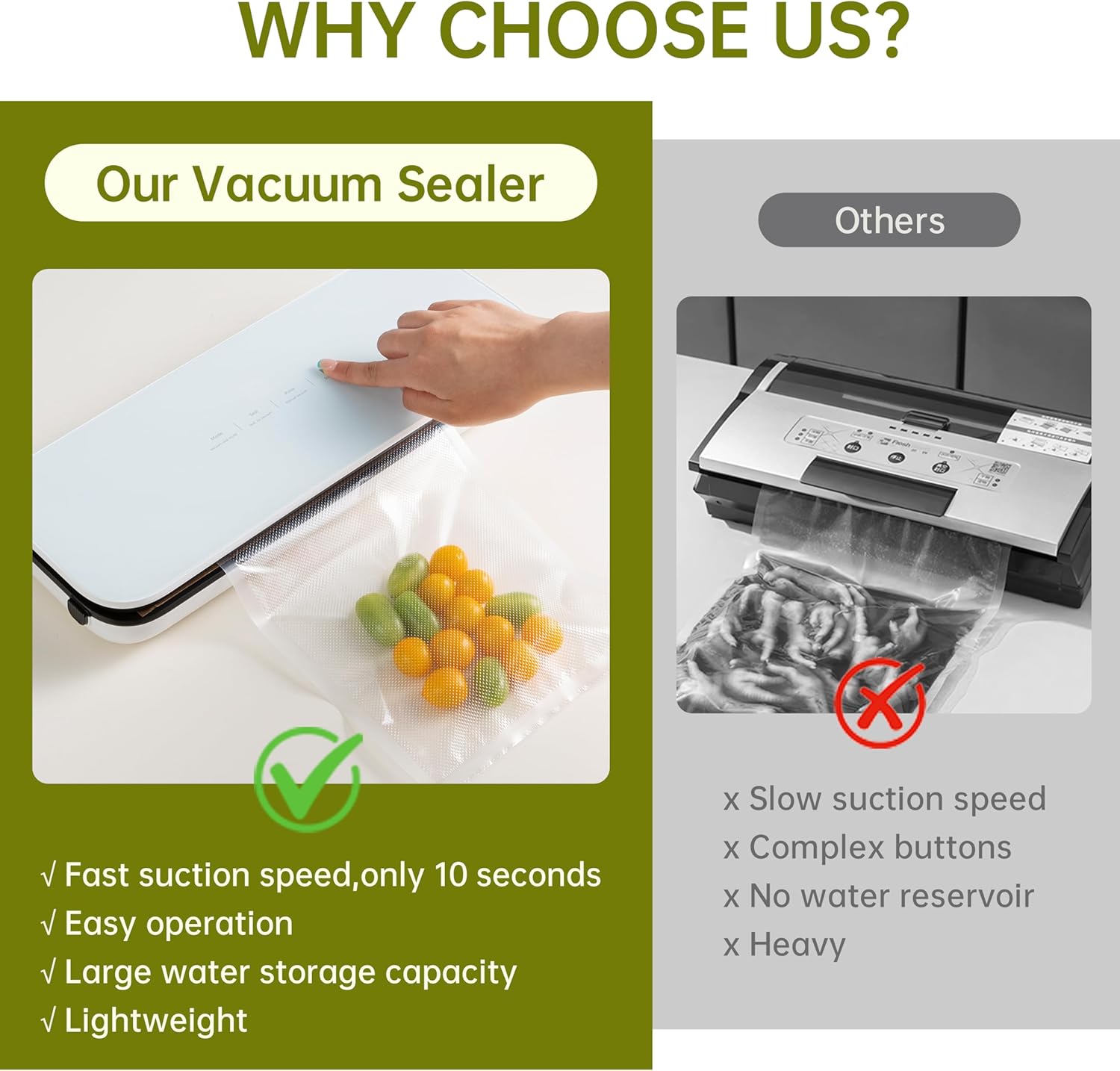 Review: This THETCHRUY Vacuum Sealer is compact, has a pocket to store the extension cord in and the functions are easy to understand. When in use the vacuum sealer works smoothly and efficiently. The choice of store or vacuum seal has already helped to streamline my vegetable storage. I have always stored cauliflower, broccoli, carrots and other vegetables individually in a gallon Ziplock bag with a paper towel inside for extra moisture absorption after cleaning and drying.Using this Vacuum Sealer I have been storing enough of my cleaned vegetables to get us through a week. The other portions of the cleaned vegetables are vacuum sealed in one or two bags depending on the volume I purchased.When the vacuum sealed bags are opened the vegetables are just as fresh as having been purchased that day. I have not dug through a gallon bag of vegetables and discarded any that were getting old or looking discolored since the arrival of this handy tool.Using this Vacuum Sealer is not complicated and also is basically self-explanatory. There is an easy-to clean catch basin “sink” for moisture that is pulled out of the vegetables to land in.With the price of food rising exponentially, using this Vacuum Sealer has lowered my grocery expenses. My shopping, storing and cleaning times have been reduced. I am not purchasing, unloading and storing the amount of food I always have with the thought that some is just going to ruin and there is nothing I can do to stop the process of the food aging.Why I waited so long to own such an incredible, money saving tool I cannot answer. Old habits are hard to break but need to be broken when money is being spent on food that is going to age and inevitably be thrown away.The cost of purchasing more bags for the vacuum sealer is reasonable for enough bags to last a few months for my purposes.If you are contemplating purchasing a Vacuum Sealer I recommend this Thetchry Vacuum Sealer with full confidence that you will be pleased with the machine’s functionality and the reduction in your grocery bill.I haven’t used the Vacuum Sealer for meat up to this time and speak to that function but cannot imagine having anything except a good experience after learning the best option of use for meat or any particular food.For storing vegetables I 100% recommend this Vacuum Sealer!!