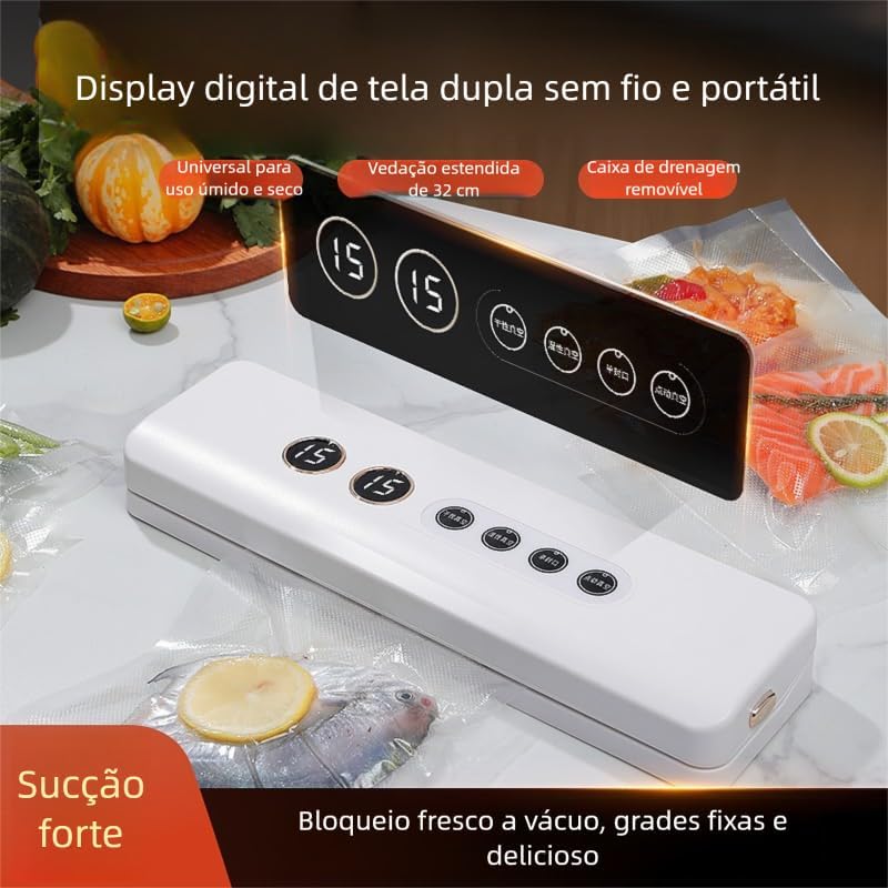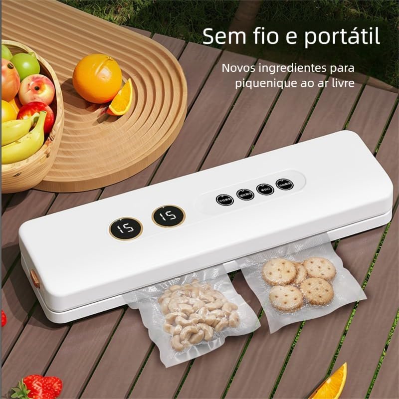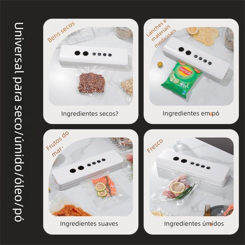 - Funções adicionais: Alguns modelos oferecem funções como selagem apenas, vácuo para alimentos úmidos e secos, e compatibilidade com potes a vácuo.