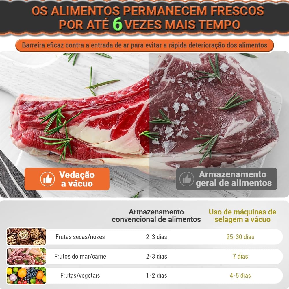 O tempo de conservação varia de acordo com o tipo de alimento e as condições de armazenamento. Em geral, a selagem a vácuo pode aumentar a durabilidade dos alimentos em até 3 a 5 vezes. Por exemplo, uma carne que duraria 3 dias na geladeira pode durar até 15 dias após a embalagem a vácuo.