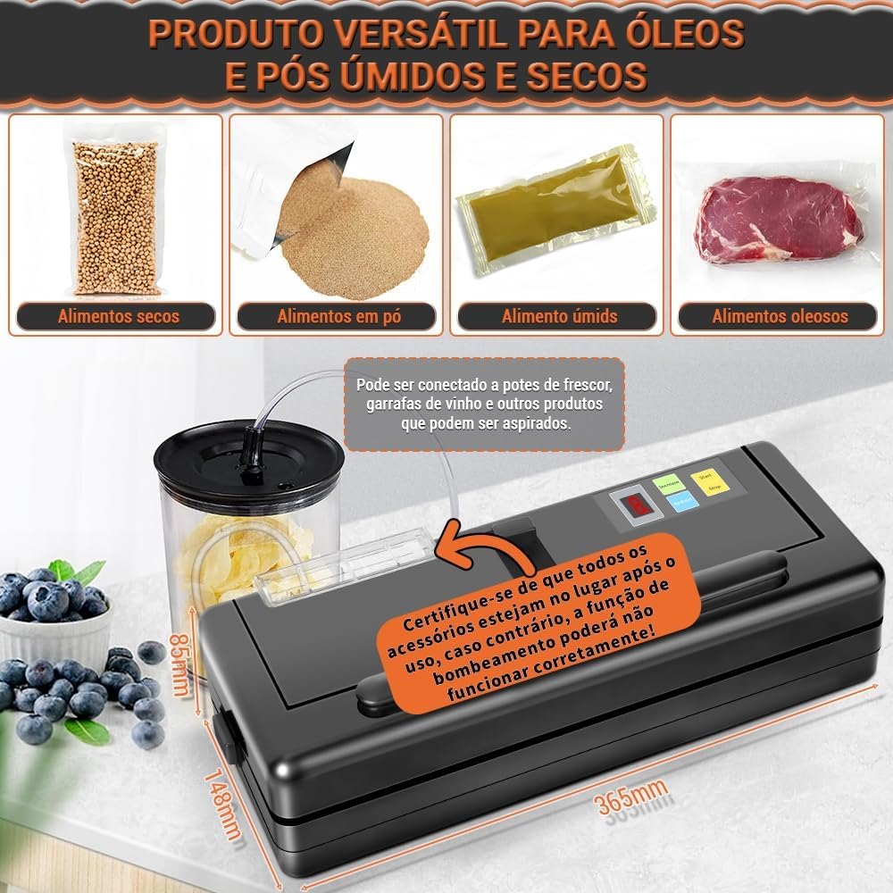 Este modelo é ideal para quem está começando. É compacta, fácil de usar e tem um preço bem acessível. A selagem a vácuo é eficiente para alimentos secos e sólidos, como grãos, castanhas e queijos. Contudo, para alimentos com líquidos, como carnes marinadas, pode ser um pouco problemática. A potência de sucção é boa, mas não tão forte quanto em modelos mais caros.