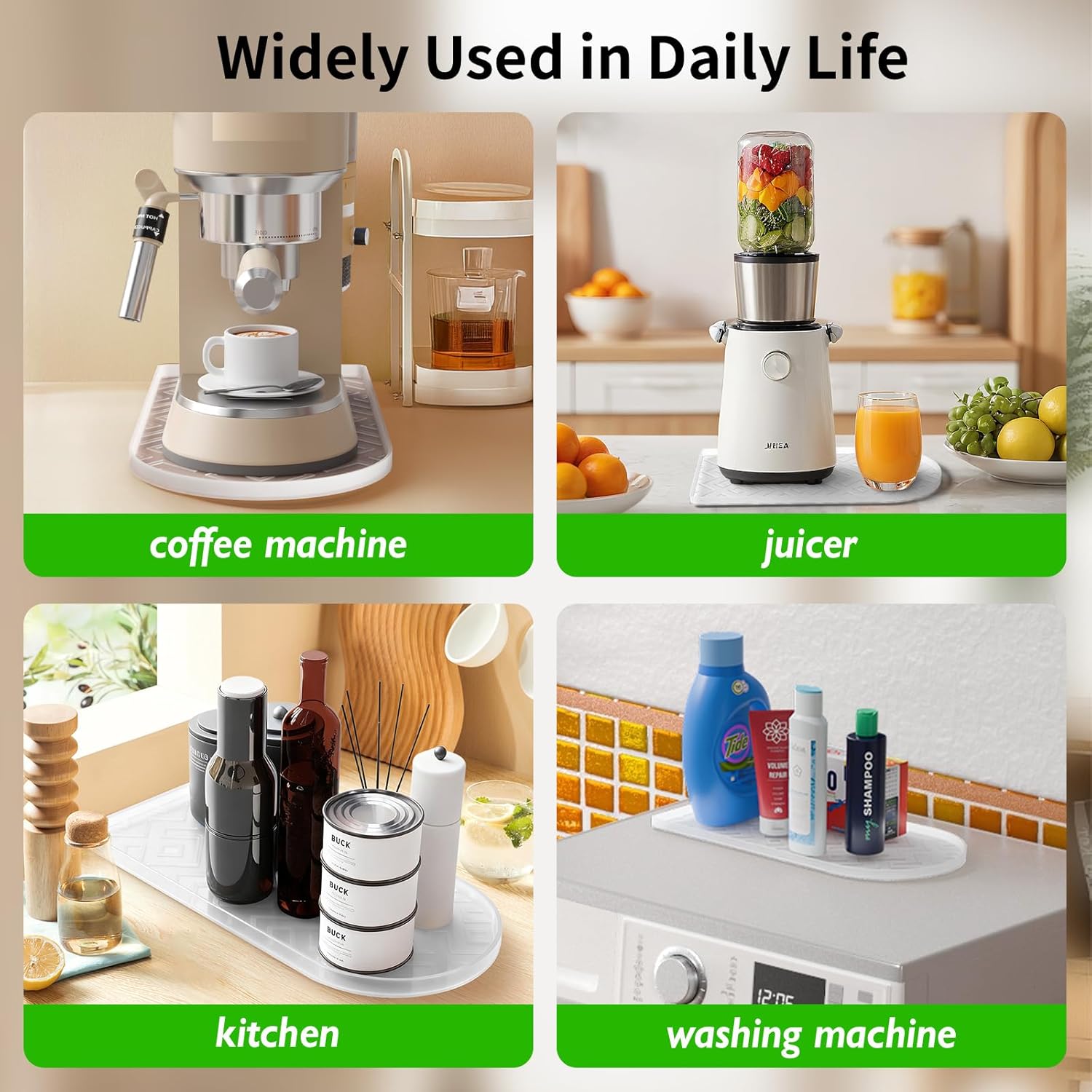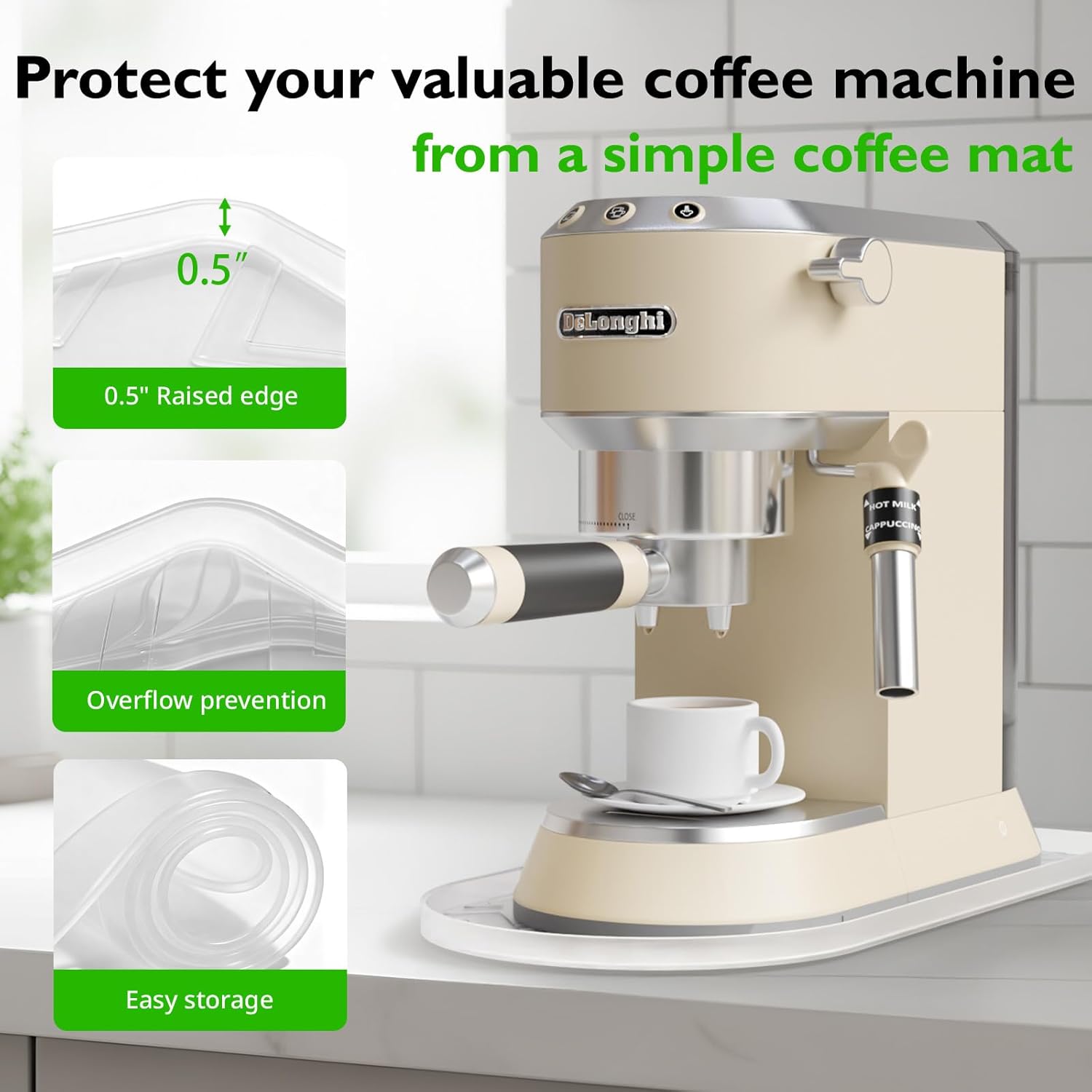 Review: I really like this coffee mat because it will hold both my Keurig and coffee grinder. In the past, fresh coffee grounds have gotten on the counter and under the Keurig making it a hassle to clean. With this silicone mat, any spilled grounds do not spread and are very easy to pick up. Also, if water is spilled, it is contained by the edge of the mat.I think this would also be a good mat for pet food bowls. Your furry friends would not be able to push them off the mat and any spilled food and water would be easy to clean.If you keep olive oil or spices on the counter, this mat is a good way to protect your counter from oil stains.I can also see using this by a bathroom sink for organization and to catch spills.I highly recommend this mat and think it would be a great gift for a coffee lover.