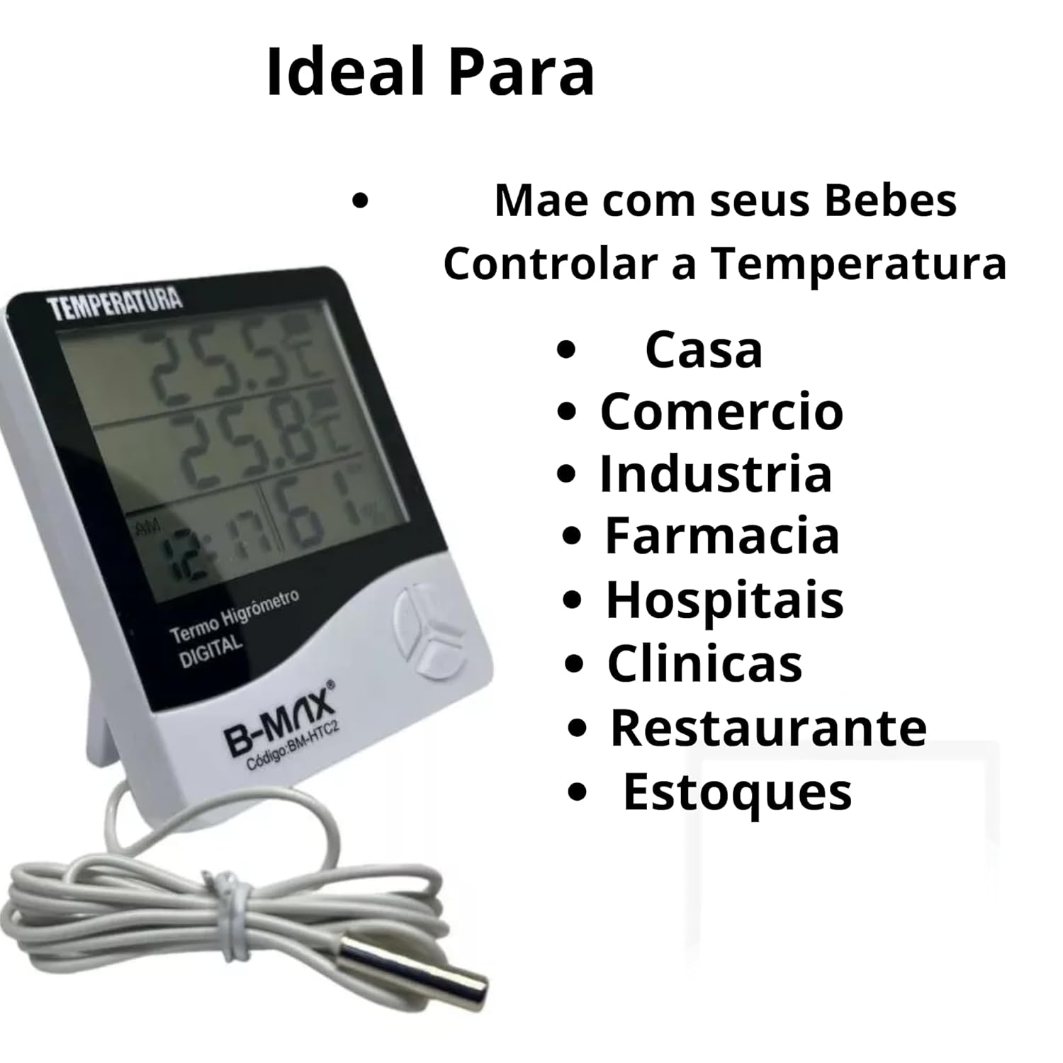 CARACTERÍSTICAS PRINCIPAIS: ✅ Visor LCD Ultraclaro: Tela de alta definição com caracteres grandes para leitura instantânea de temperatura (°C/°F), umidade (%) e horário. Ideal para ambientes escuros ou com pouca luz! ✅ Precisão Profissional: Margem de erro mínima: ±1°C (temperatura) e ±5% UR (umidade). Resultados confiáveis para uso doméstico, comercial ou industrial. ✅ Multifuncionalidade Inteligente: Registro de máximas e mínimas (24h), relógio digital integrado e operação estável mesmo em uso contínuo. ✅ Alta Resistência e Durabilidade: Corpo em ABS à prova d’água e resistente a impactos. Funciona em condições extremas: -50°C a +70°C (perfeito para freezers e câmaras frigoríficas). ✅ Cabo Sensor Longo (1,5m): Medição flexível em locais de difícil acesso. Instale o visor fora do freezer ou aquário e monitore remotamente! ESPECIFICAÇÕES TÉCNICAS: 🔧 Tipo: Termômetro Eletrônico Digital + Higrômetro 🔧 Material: Plástico ABS Premium (antiderrapante e antidesgaste) 🔧 Dimensões: 107 x 100 x 20 mm | Peso: 125g (compacto e portátil) 🔧 Fonte de Energia: 1 pilha AAA 1,5V (não inclusa – fácil substituição) DETALHES DE FUNCIONAMENTO: 📏 Intervalo de Medição: Temperatura: -50°C a +70°C Umidade: 10% a 99% UR ⏱️ Registro de Dados: Histórico de máximas e mínimas atualizado automaticamente. PARA QUEM É ESSE PRODUTO? Cozinhas Profissionais: Controle rigoroso de freezers e geladeiras. Aquaristas: Garanta a saúde de peixes com medição precisa em aquários. Empresas: Monitore câmaras frigoríficas, estoques ou ambientes industriais. Uso Doméstico: Evite desperdícios em geladeiras e armários úmidos. CONTEÚDO DA EMBALAGEM: 📦 1 Termômetro Digital + Higrômetro AVISOS IMPORTANTES: ⚠️ Bateria não inclusa – utilize pilha AAA de qualidade para maior precisão. ⚠️ Pequenas variações de cor ou tamanho podem ocorrer devido às configurações de tela ou medição manual (diferença máxima de 2 cm).
