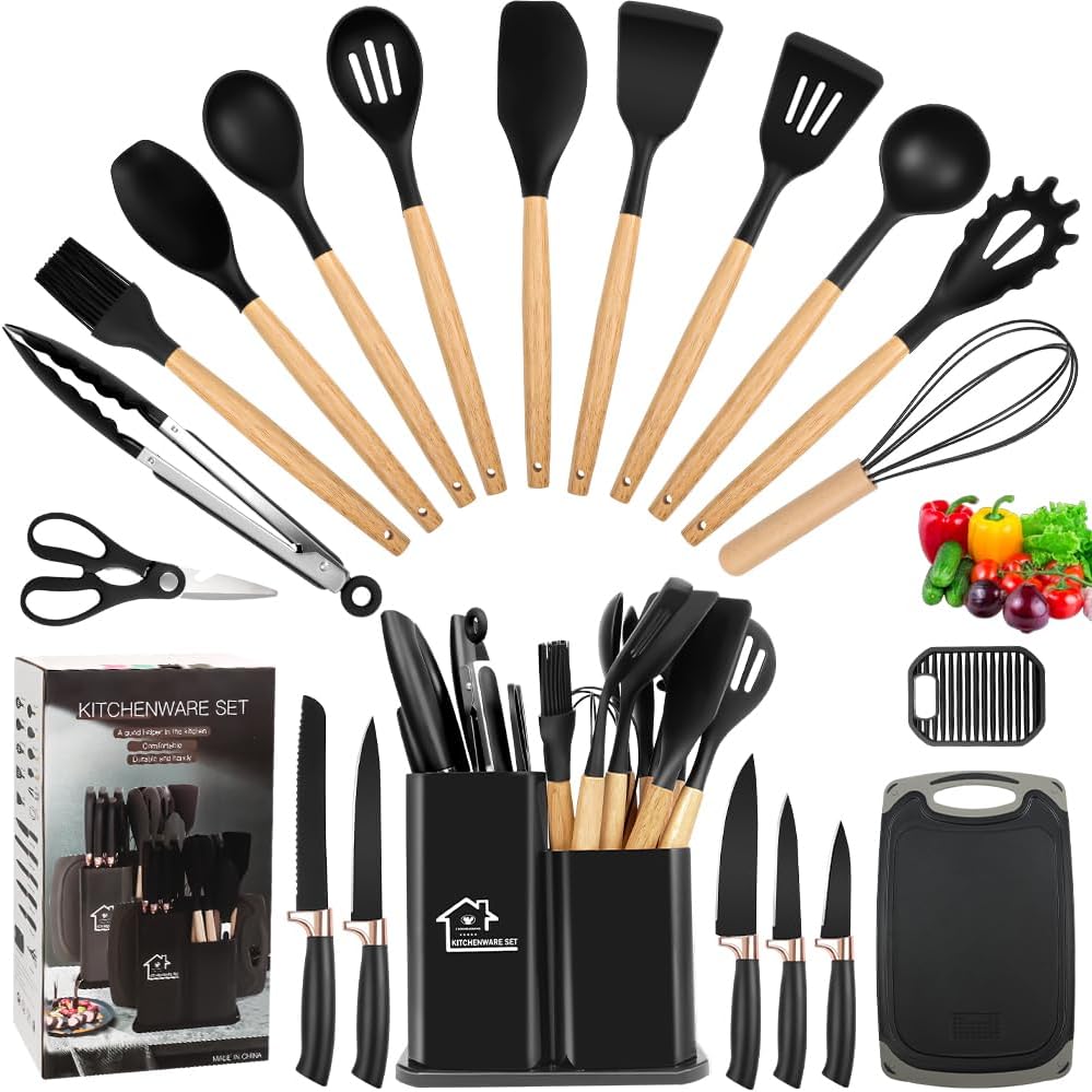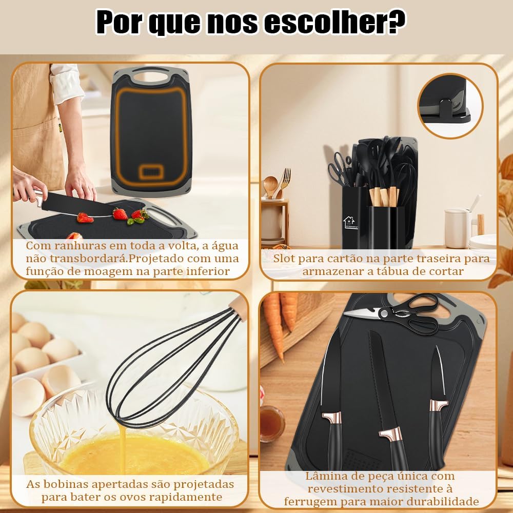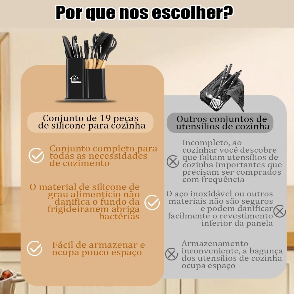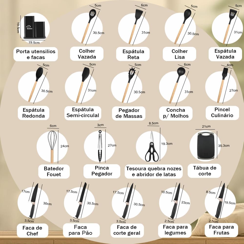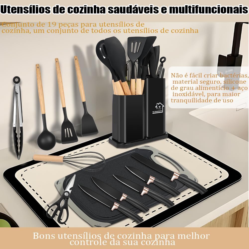 - O kit inclui 19 peças de utensílios de cozinha silicone, incluindo espátulas, colheres, batedeiras, facas e mais.
