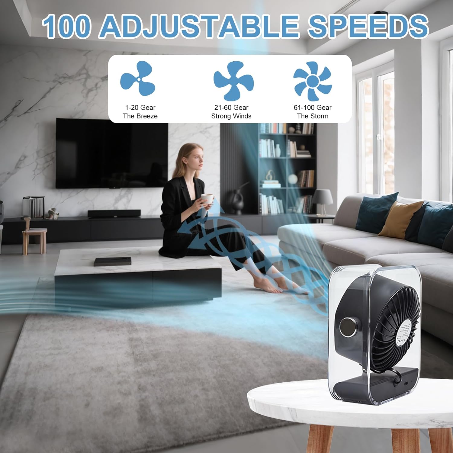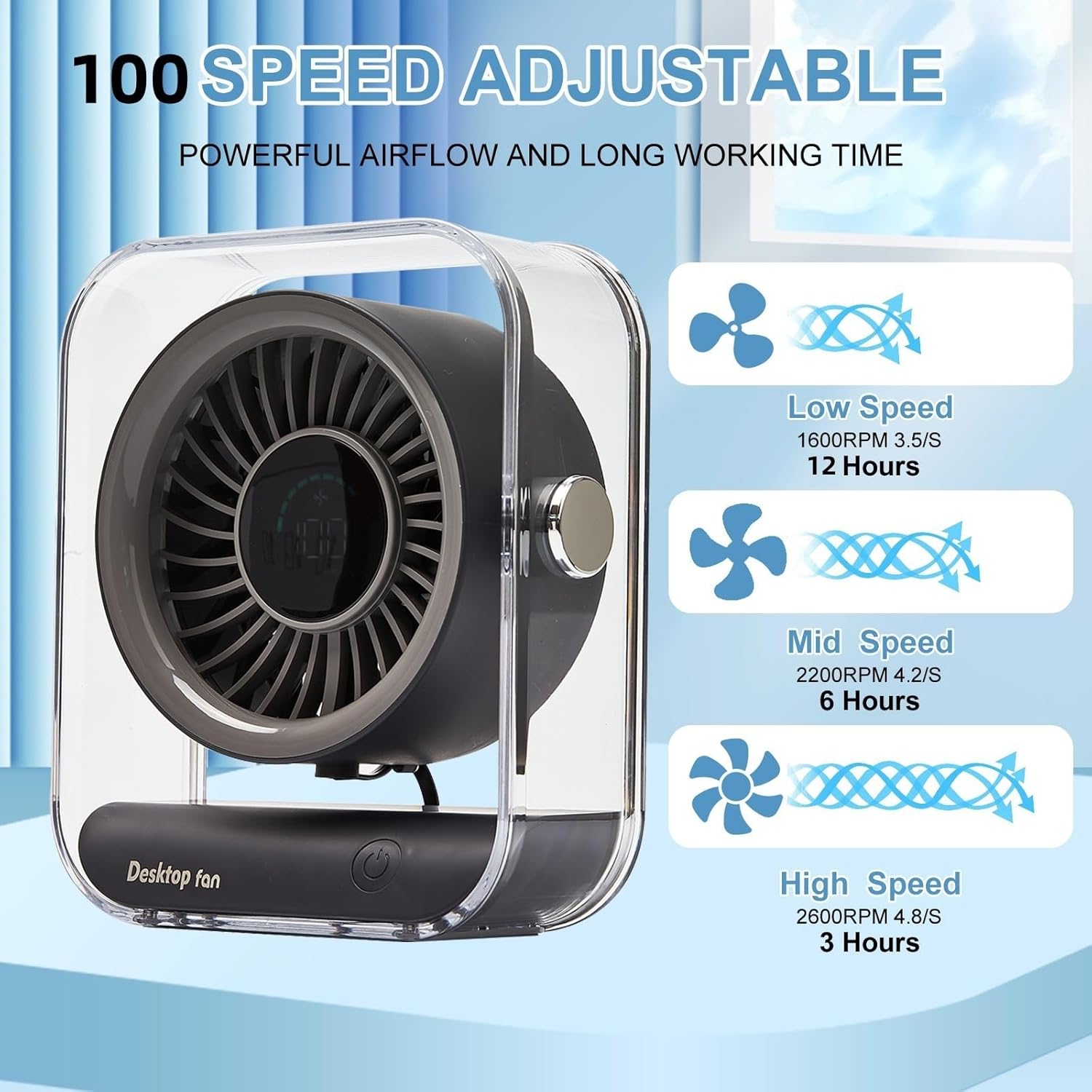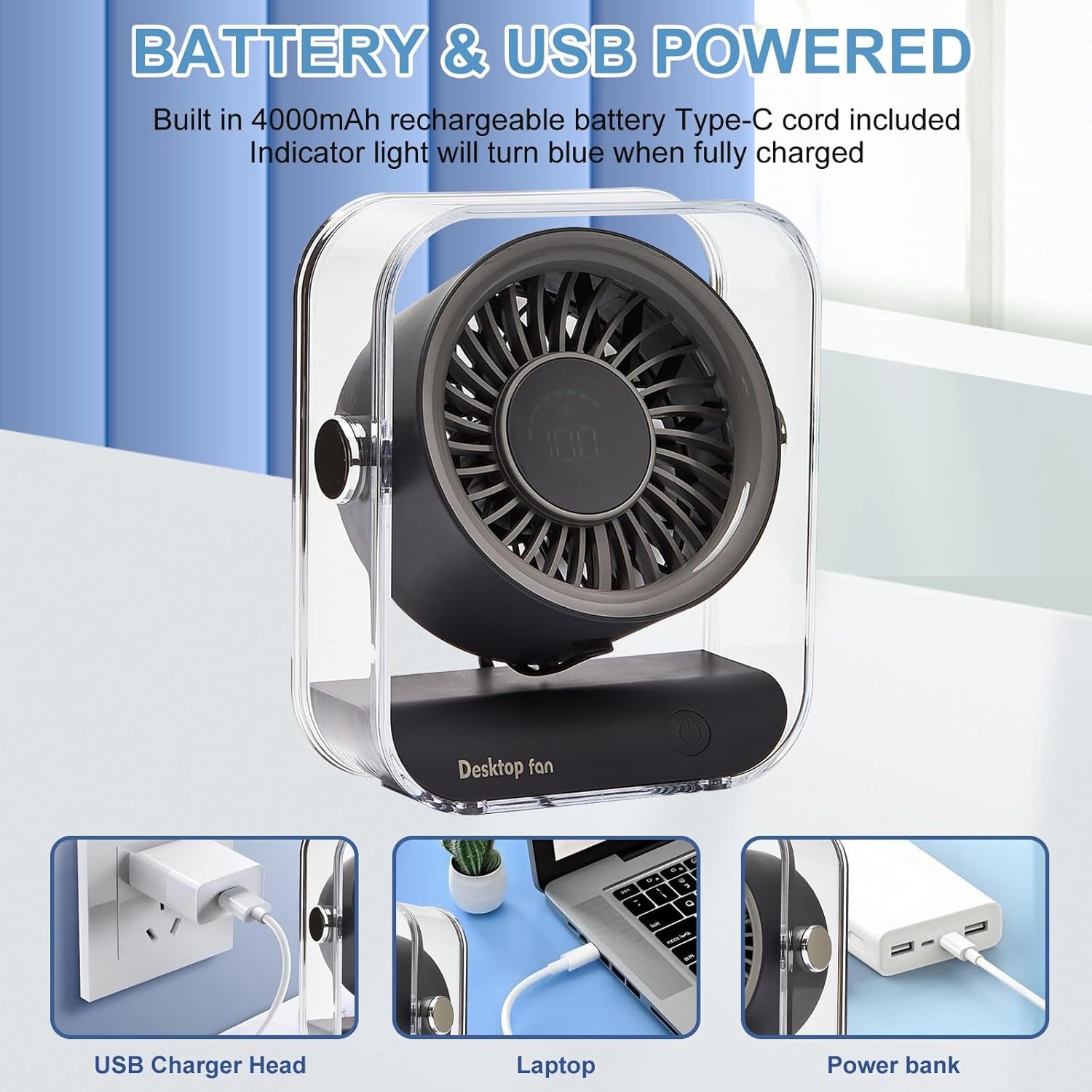 Review: Great fan, especially at the price!!! It’s great that it has a battery you can charge and then take the fan wherever you go. It’s very compact but powerful. You can tilt the fan up or down which makes it very functional. There is a durable plastic like “cage” around the fan for protection from drops. It literally has 100 speeds! Powerful airflow and to top it all off, it looks really cool as well. I would definitely recommend!